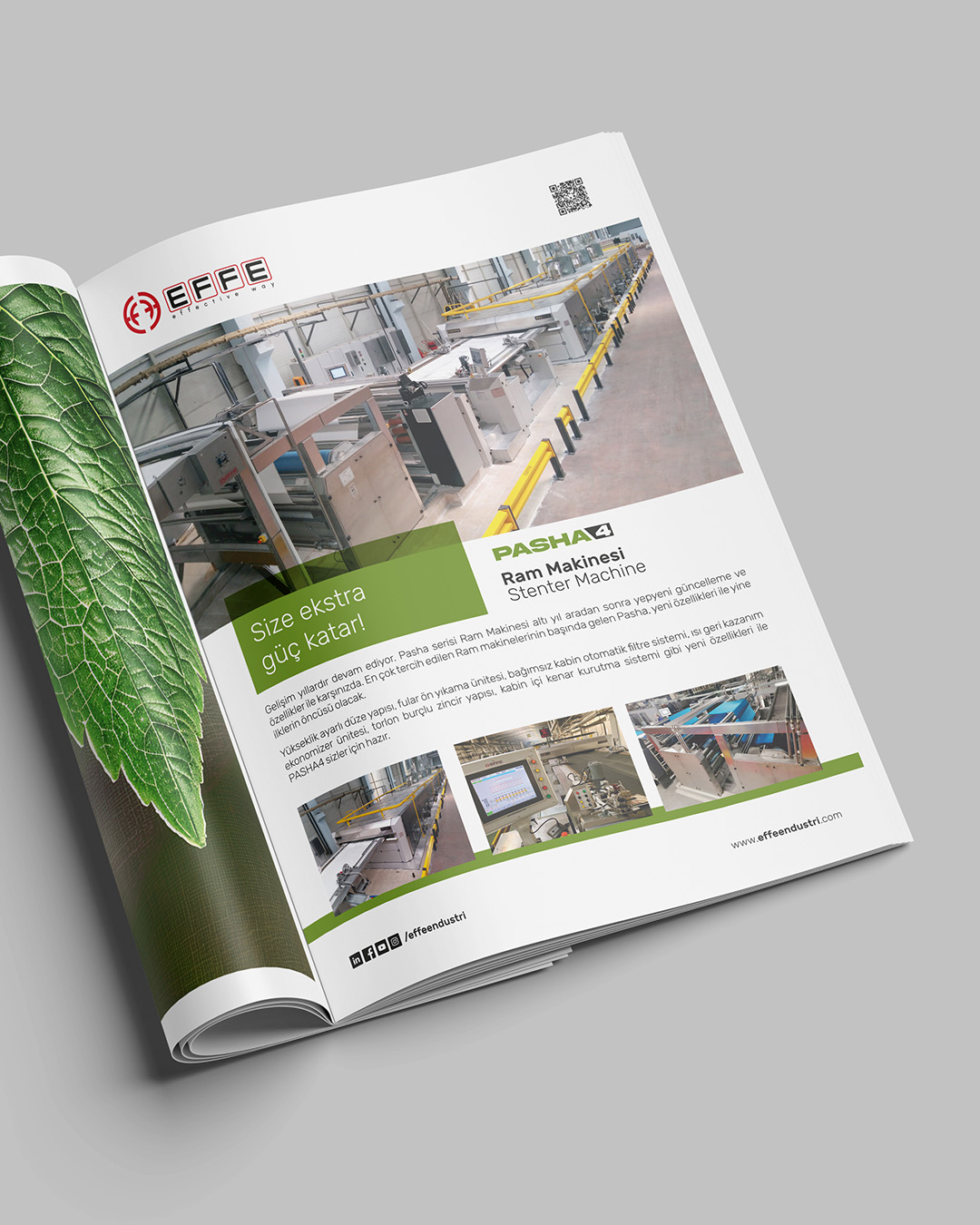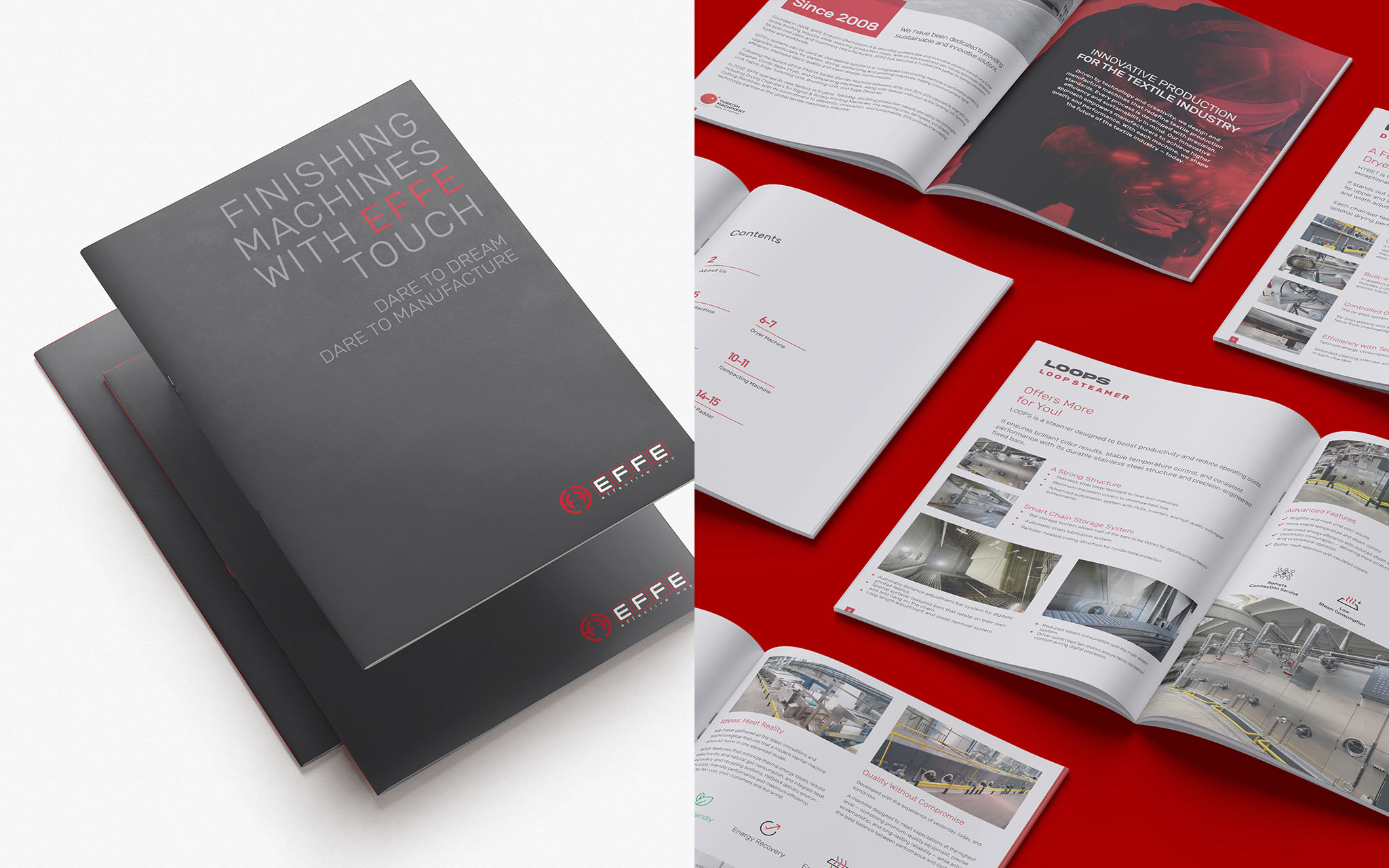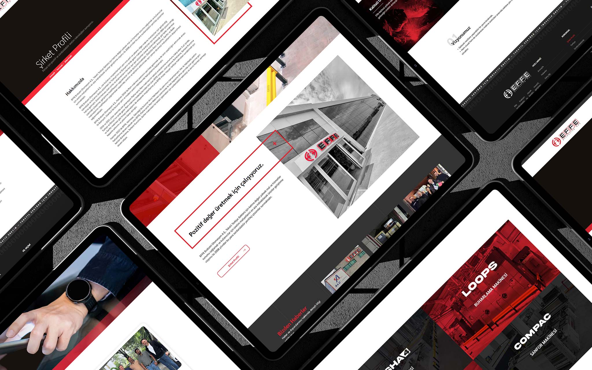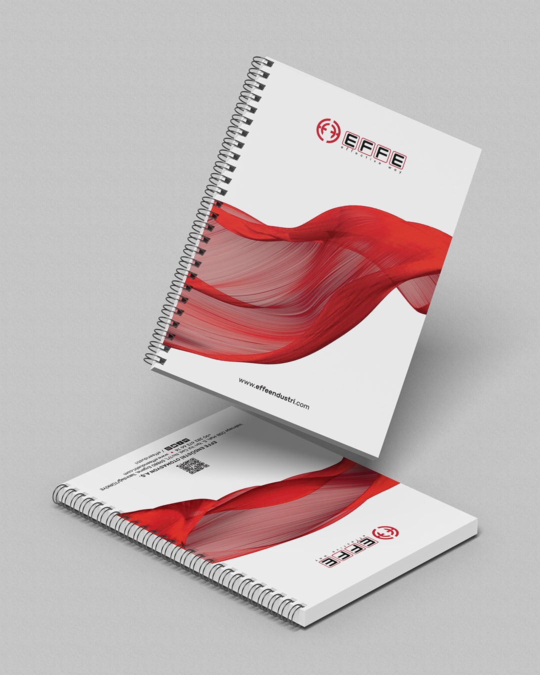 Effe Makine için web sitesinden kataloglara, fuar alanı tasarımlarından dergi reklamlarına; takvimlerden not defterlerine ve sosyal medya çalışmalarına kadar uzanan bütüncül bir tasarım dünyası kurguladık. Makinenin gücünü ve mühendisliğin disiplinini, net ve etkileyici bir görsel dile dönüştürdük.