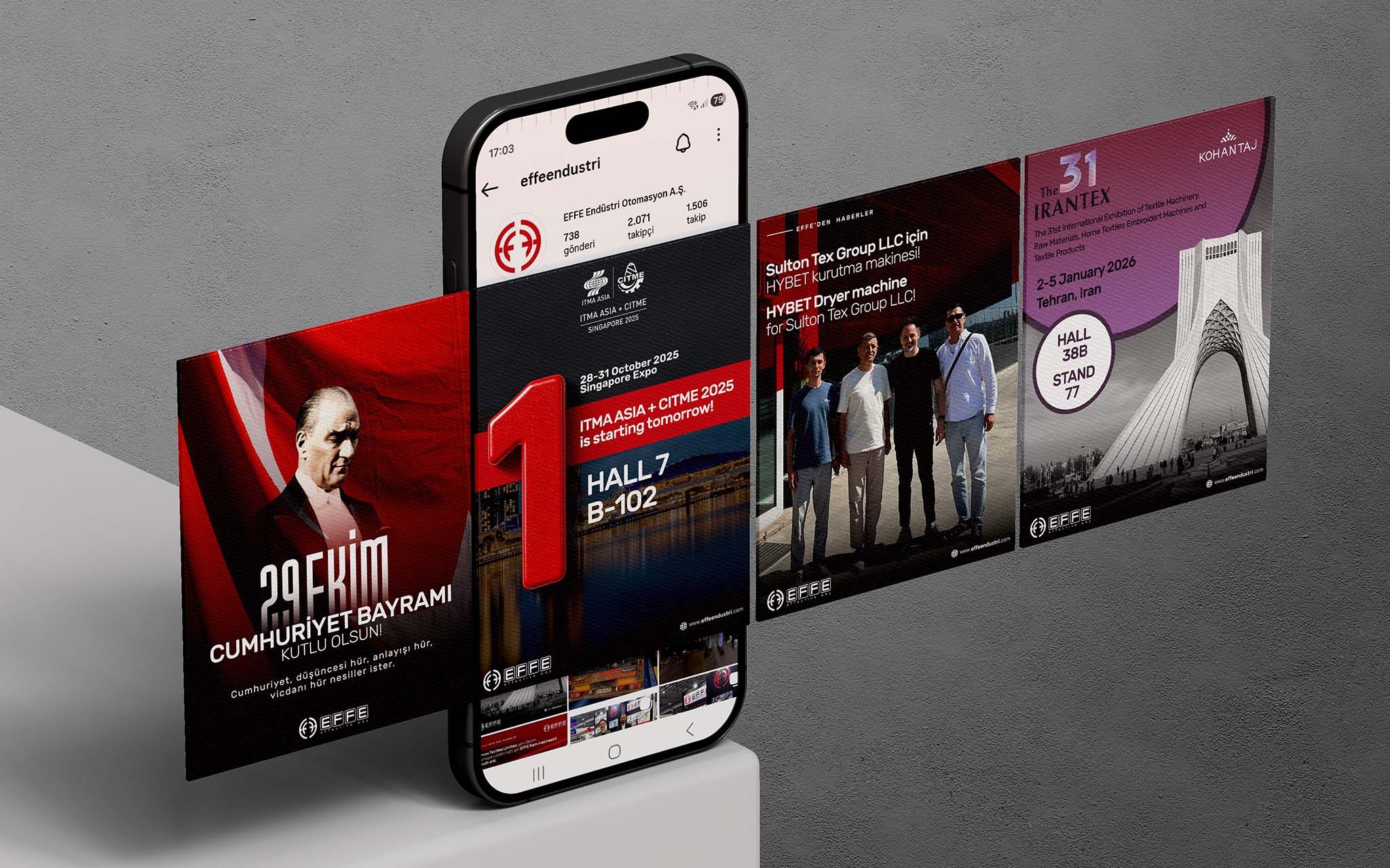 Her temas noktasında tutarlı bir kimlik oluşturarak markanın sahadaki varlığını ve sektördeki iddiasını daha görünür hale getirdik. Ortaya çıkan bu güçlü tasarım ekosistemi, Effe Makine’nin vizyonunu her mecrada kararlı ve profesyonel bir duruşla yansıttı.